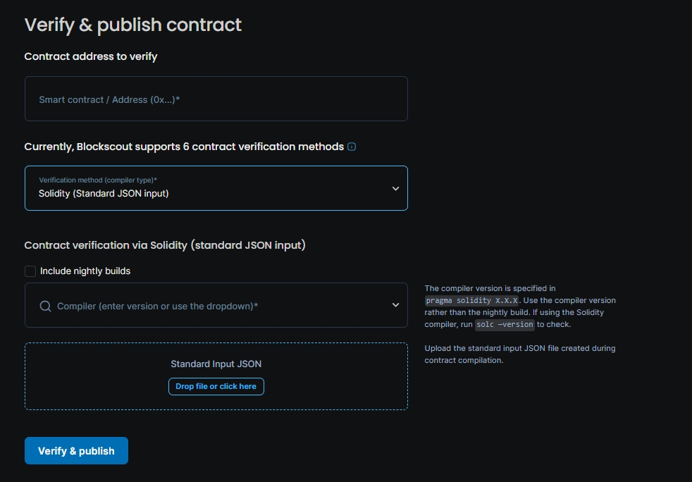 Enter in the contract address you received during deployment. The dropdown will show you several available verification options. Select the one you would like to use and continue.