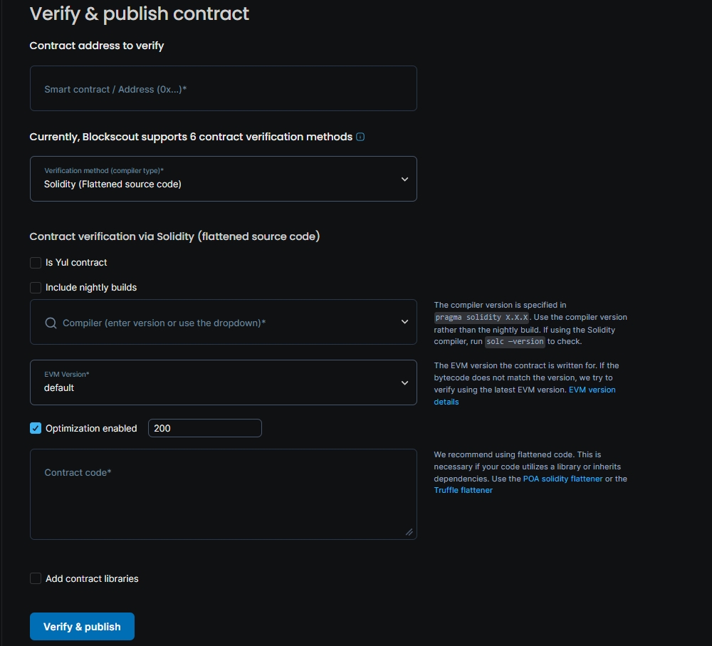 Enter the Solidity Contract Code: You may need to flatten your solidity code if it utilizes a library or inherits dependencies from another contract. We recommend hardhat or the POA solidity flattener. To flatten your contract using contract, run:
