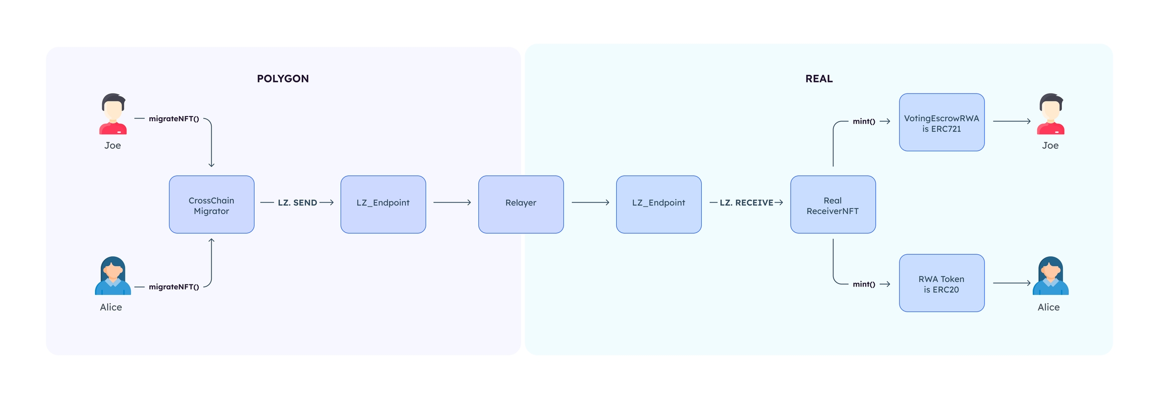 The CrossChainMigrator will send a message to the LayerZero endpoint on Polygon to then be passed by their Relayer over to Real Chain where the message will be passed to the RealReceiver contract.