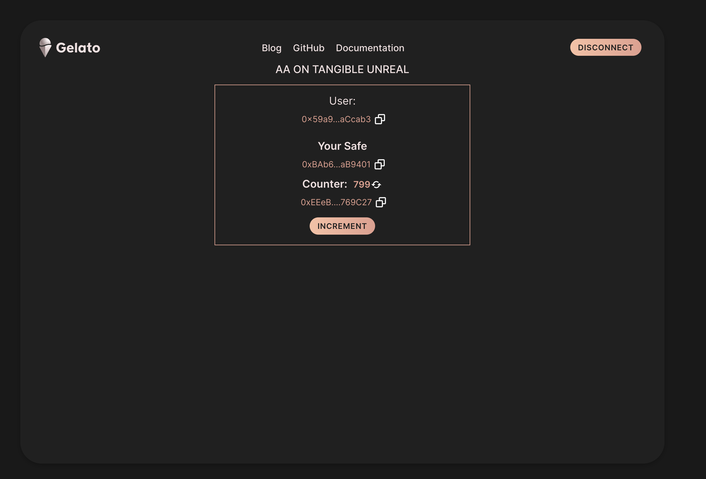 In following examples examples, it will be called the `increment()` method on this simple counter contract deployed on unreal <https://unreal.blockscout.com/address/0xEEeBe2F778AA186e88dCf2FEb8f8231565769C27>